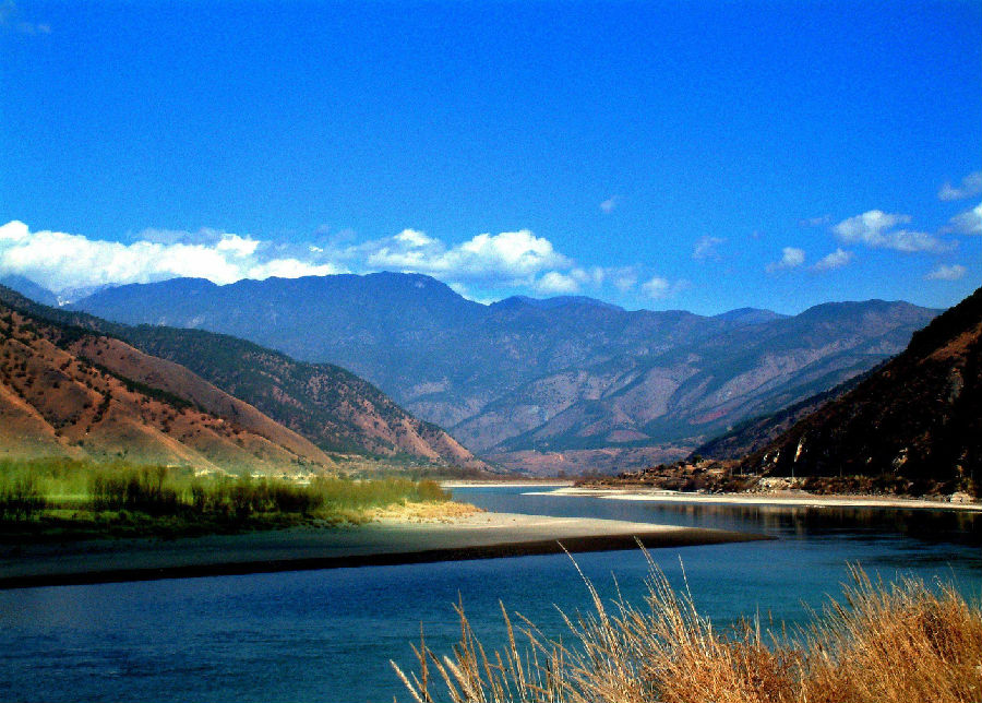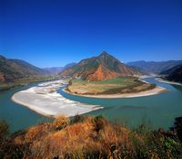 长江第一湾长江第一湾,位于丽江纳西族自治县石鼓镇。万里长江,从“世界屋脊”青藏高原奔腾而下,由滇西北进入云南,与澜沧江、怒江一起,一直并肩在横断山脉的高山深谷中穿行。 在南北走向的云岭、怒山、高黎贡山三大山脉的夹持之下,在滇西北境内形成了"三江并流"的举世奇观。金沙江,指长江上游从青海省玉树县巴塘河口至四川省宜宾市岷江口一段,全长2308公里。相传过去沿江一带的居民曾取沙淘金,所以叫金沙江。它流出青海,经西藏从德钦县进入云南,继续南流于横断山区,到了石鼓镇后因山崖阻挡便掉头急转东北而去,形成一个巨大的“V”形转弯,这一奇观被称为“万里长江第一湾“。